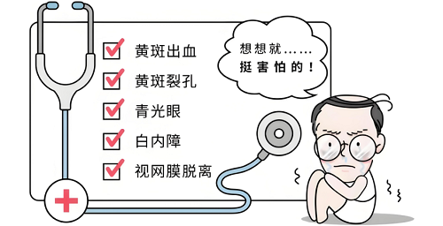 当高度近视患者的眼轴不断变长,可能会使眼底发生一些改变。如果发生黄斑中心凹出血、视网膜下新生血管等,就会影响视力,也可能发生玻璃体液化、玻璃体后脱离、视网膜周边格子样变化,出现黄斑裂孔等,继而导致视网膜脱离。另外,高度近视发生白内障、青光眼的风险也会显著增加。