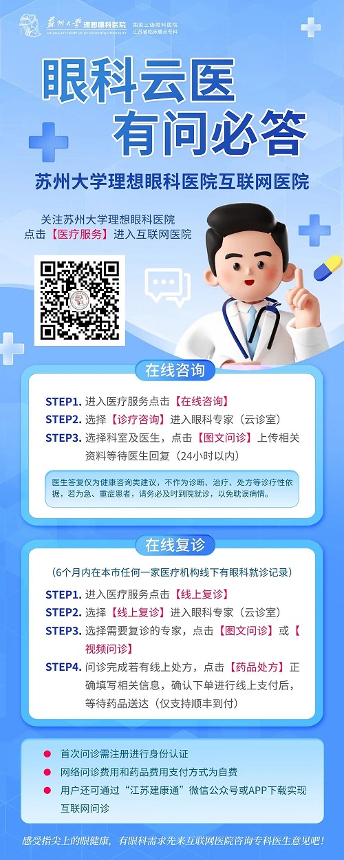 想要就诊时,你是否常有这些诉求:长期用药,可以手机上开药吗?眼睛不适,能不能线上咨询一下医生咋办?为进一步提升医疗服务质量,简化就诊流程,让患者“少跑腿”,苏州大学理想眼科互联网医院线上服务给患者带来了很大的方便,可线上问诊、在线购药。