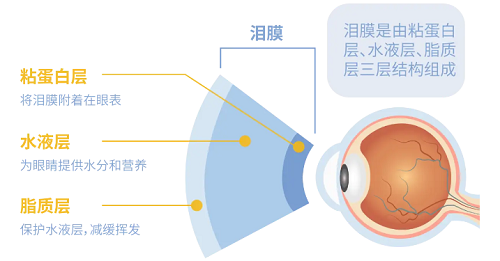 通俗来说,就是眼睛的表面缺眼泪水了。这个眼泪水由三层物质组成,表面的油,中间的水和底层的蛋白质。也就是脂质层、水液层以及黏蛋白层。正是得益于这种油包水的组成方式,才能够充分保护我们的眼睛。