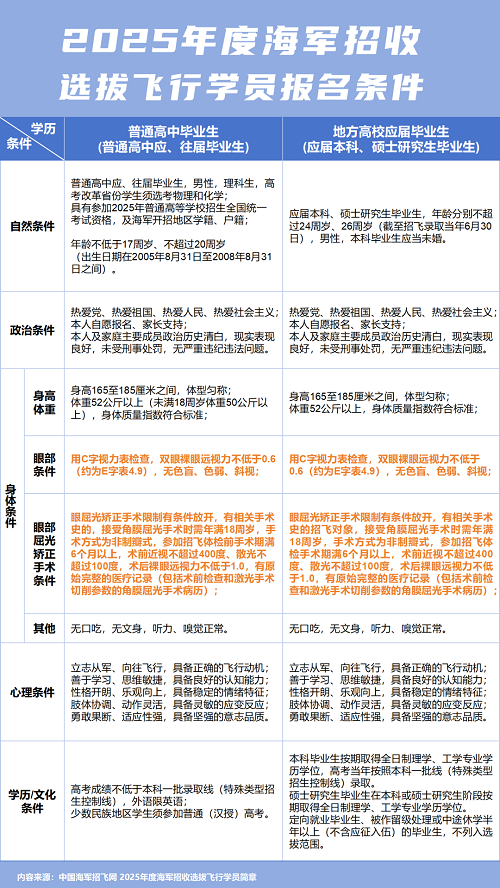 近日,海军2025年度招飞选拔全面展开,此次选拔放宽眼科相关标准,这意味着视力矫正后的青年有望成为海军飞行员!