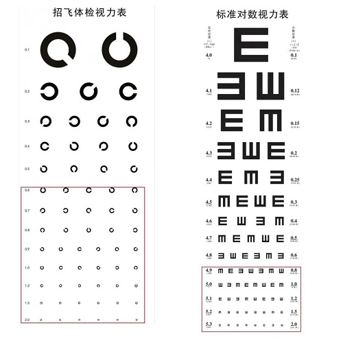 用C字视力表检查,双眼裸眼远视力不低于0.6(约为E字表4.9);