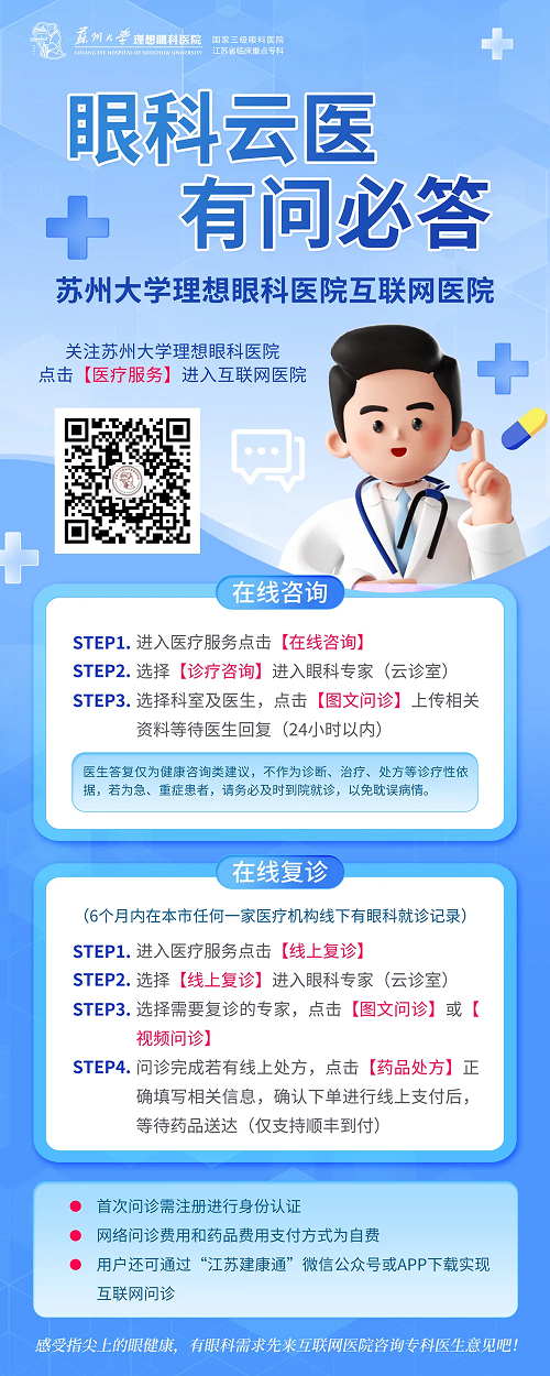 为不断满足广大市民朋友看病就医需求,充分发挥互联网诊疗优势,使市民朋友们足不出户就能享受到三甲医院的优质医疗服务......您可以通过苏州大学理想眼科互联网医院体验专家咨询、线上复诊、药品配送到家等服务,大大节省了时间和精力。