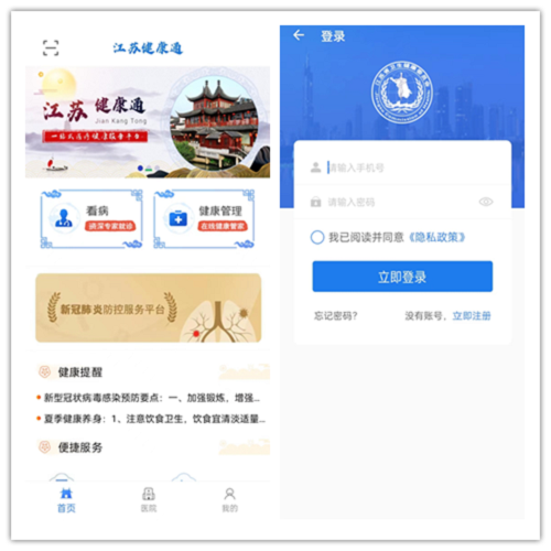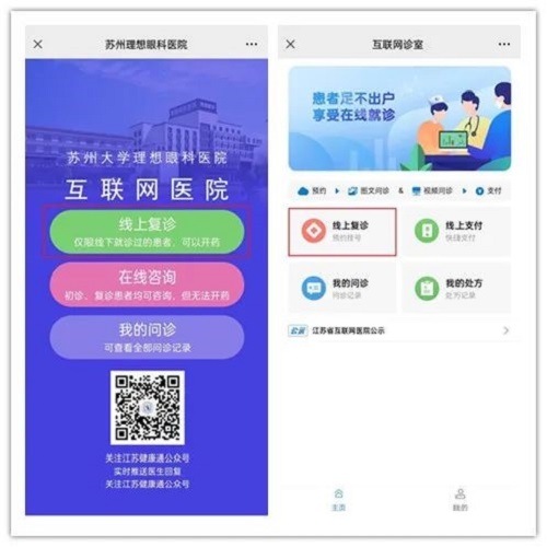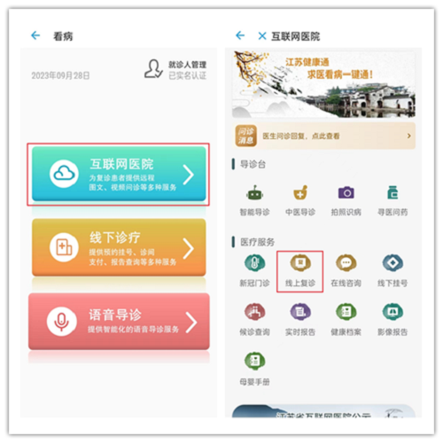 下载“江苏健康通”APP,选择“看病”,首次登录平台需注册。点击“互联网医院”,选择“线上复诊”,选择“出诊”专家,进行“图文问诊”或“视频问诊”。