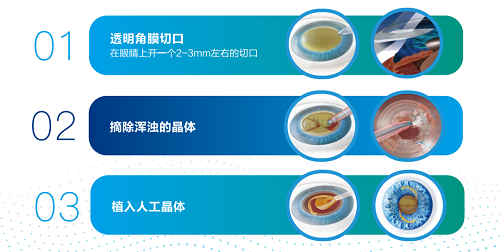 目前没有任何药物被证实能有效治疗白内障。行之有效的方法就是手术。主流的手术方式为白内障超声乳化吸除+人工晶状体植入术。超声乳化白内障手术技术目前已经非常成熟,通过约3mm的微创切口,将混浊的白内障粉碎吸出,然后推入一枚透明的人工晶状体。