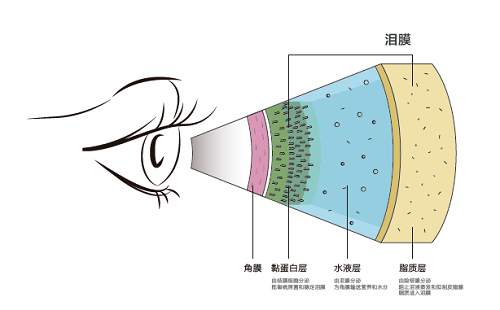 泪膜是由黏蛋白层、水液层、脂质层这三层结构组成的,最外层的是脂质层,中间的是水液层,最内是黏蛋白层。