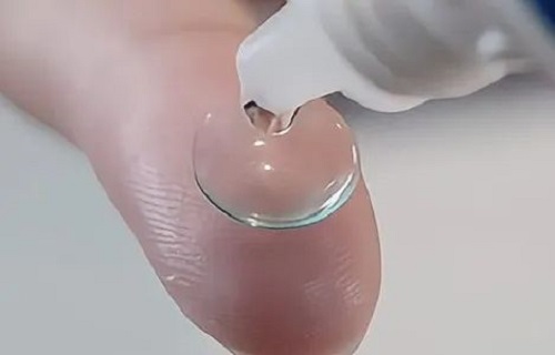 ③然后先用硬镜护理液揉搓镜片,再用生理盐水冲洗干净,将镜片的凹面向上置于右手食指尖,并在凹面注入一滴海露。
