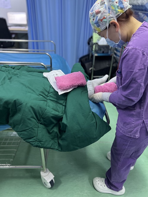 由于眼专科手术特点,眼科手术室温度相比综合性医院手术室温度偏低,俗话说:寒从脚上起。为防止老人全麻苏醒期低体温不适,为老人穿上温暖袜子。