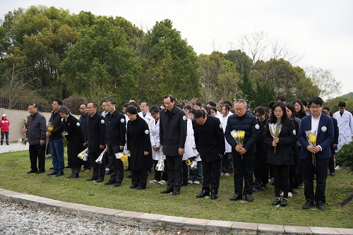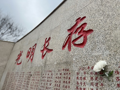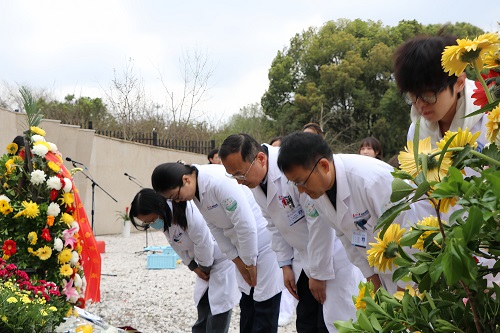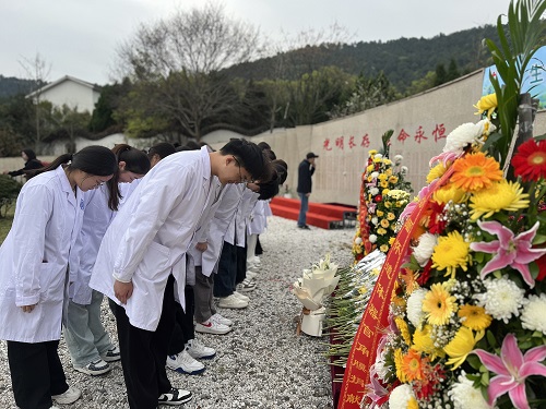 活动最后,在场所有人面向纪念墙深深鞠躬,将手中的白菊轻轻摆放,表达对捐献者的缅怀与敬意。