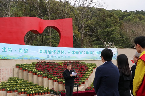 纪念园苍松凝翠,白菊含霜,全体人员庄严肃立。苏州市红十字会党组书记、常务副会长刘文伟介绍了我市遗体(器官、角膜)捐献工作情况。截至目前,全市志愿登记遗体器官捐献者人数已突破6.5万人,累计实现遗体捐献1606例、角膜捐献1028例、器官捐献227例。市民群众对遗体(器官、角膜)捐献的知晓度和认同度逐年提高,报名登记数和实现捐献数逐年上升。