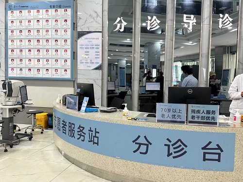 每个候诊区域均设置敬老专座,免费为70岁以上老人提供老花镜、一次性纸杯、饮用水、轮椅等便民服务设备。如果有眼疾行动不便的老人进入候诊区,门诊医务人员会主动上前,一对一帮扶,协助老人就座,并为老人调整座椅位置,方便老人休息和就诊。