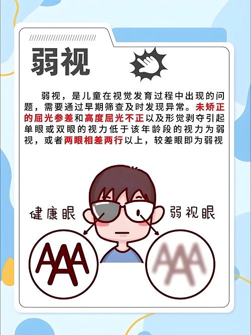 弱视则指即使佩戴合适眼镜,视力仍低于正常水平,伴有视物模糊、阅读困难等问题,多因儿童视觉发育关键期存在斜视、高度远视等问题。