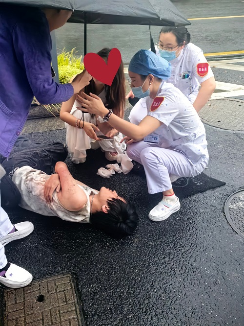 “男生当时捂住肋骨躺在地上,呼叫无应答,我们的心都提到了嗓子眼。” 回忆起当时的场景,参与急救的医护人员仍心有余悸。他们一边拨打 120和110说明情况,一边观察伤者状态。数秒钟后,男生恢复意识,众人悬着的心才稍作平复。