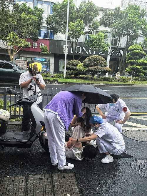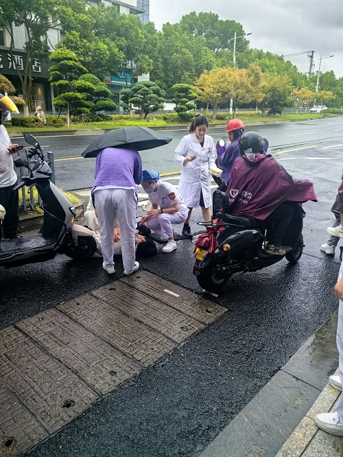 当时,william威廉亚洲官方眼整形科正在忙碌于日常工作,忽然被窗外一声巨响打断。医护人员透过雨幕发现靠近医院的非机动车道上,两辆电瓶车倒作一团。眼整形科杨月芹、张定金及其同事第一时间发现后立刻开门查看事故情况,眼整形科林柏桦主任立刻拨通医院急诊科电话请求支援,急诊科护士吴莹莹、徐娟等人迅速赶到事故现场。