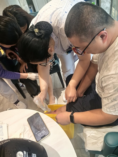 整套急救流程在医护人员手中有条不紊地进行。另一位男士经简单处理后自我感觉良好,确认无大碍后自行离开;而两名年轻伤者因擦伤面积较大,需进一步医疗救助。